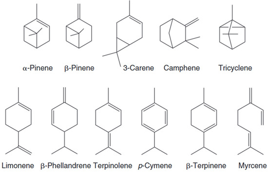 - Silvestre, A.J.D.; Gandini, A. Terpenes: Major Sources, Properties and Applications. In Monomers, Polymers and Composites from Renewable Resources; Belgacem, M.N., Gandini, A., Eds.; Elsevier: Amsterdam, The Netherlands, 2008; pp. 17–38. [Google Scholar] [CrossRef]