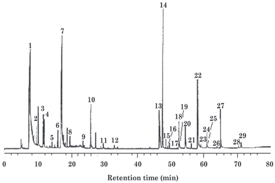 There are 29 real peaks in the total ion chromatogram (TIC) of the volatile compounds of lacquer sap [19]. The mass spectra are shown in Figure 5.