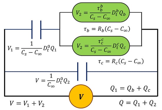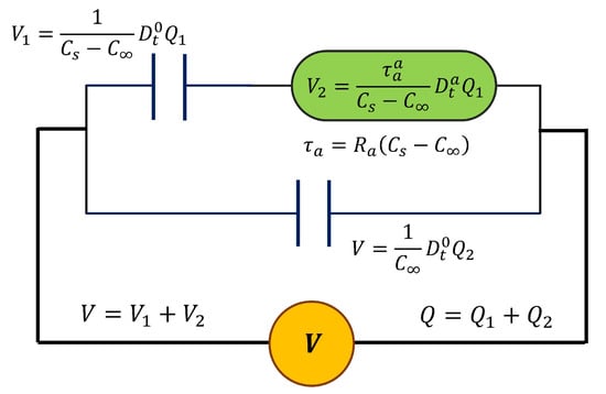 In order to obtain a symmetric response and consider the contribution of interfacial polarization or Maxwell–Wagner–Sillars (MWS) relaxation, we replaced the resistance on the Debye Model with a single cap-resistor and obtained a fractional Debye model (FDM), which is presented in Figure 2. From the constitutive equations that are presented in Figure 2, the differential equation of fractional order is obtained using Equation (3).