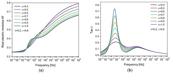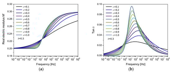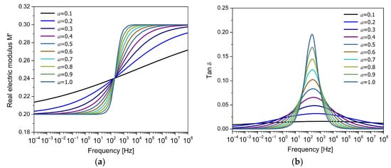 Frequency response of (a) the real part of the electric modulus () and (b) the loss factor () for the FDM model, for different values of the fractional parameter .
