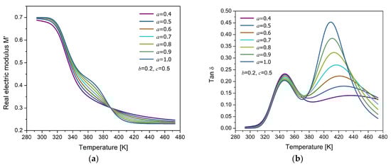 Temperature response of (a) the real part of the electric modulus () and (b) the loss factor () for different values of the fractional parameter , with fixed values 0.2 and 0.5.