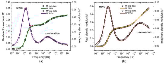 The first case corresponds to the work of Mudarra et al. [], who investigated the relaxational behavior of PEI associated with their conductivity and dipolar relaxation. PEI is a high-performance amorphous thermoplastic with a relatively high glass transition temperature (Tg493 K). Dielectric data were obtained using DEA, measuring the real and imaginary parts of the complex permittivity over a frequency range from 0.01 Hz to 1 MHz, with five frequency points per decade. Figure 8a displays the experimental dielectric response of PEI at 523 K, showing a low-frequency peak related to conductivity effects. The real and imaginary components of the electric modulus, , were simultaneously fitted using the complete expression given in Equation (16), which incorporates both MWS and -relaxation contributions. The electric modulus formalism inherently reduces the impact of low-frequency conduction. In particular, the imaginary part () suppresses electrode polarization and dc-conductivity spurious effects, allowing the model to emphasize intrinsic bulk relaxation processes. This explains the good agreement observed in Figure 8a, even in the presence of moderate conductive behavior.