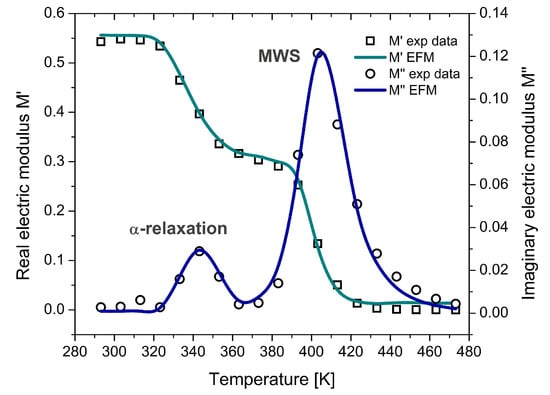 Here, is the relative permittivity at low frequencies or high temperatures, is the relative permittivity at high frequencies or low temperatures, and is defined in this work as the characteristic time for an electrical relaxation process. In polymers, the relaxation time is temperature-dependent and, under isothermal conditions, can be considered as constant. The electric modulus is mathematically defined as the inverse of the relative permittivity (Equation (5)), and from a physical point of view, it is related to the relaxation of the electric field when the electric displacement remains constant [,]. Then, using Equations (4) and (5), an expression for is obtained that corresponds to the FDM (Equation (6)).