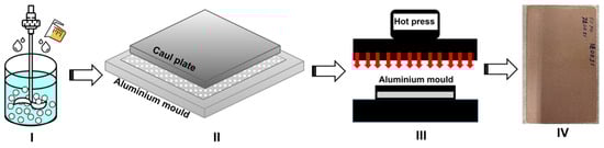 Schematic of the glass/PU hot-pressing manufacturing process: (I) mixing glass particles and PU, (II) transfer to mould, (III) hot pressing and (IV) demoulded composite.