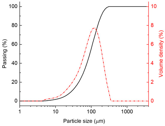 Particle size distribution (PSD) of glass particles following acoustic grinding showing the passing (%) and volume density (%) functions.