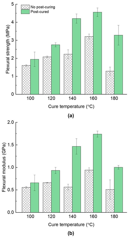 - Post-curing at 80 °C for 24 h increased the flexural strength and flexural modulus by 42% and 85%, respectively.
