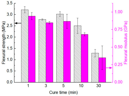 Having established the optimal curing temperature as 160 °C, the next step was to examine the influence of cure time (hot-pressing time) on the flexural properties of glass/PU composites. The curing time was varied between 1 min and 30 min (e.g., 1 min, 5 min, 10 min and 30 min) with the resultant flexural properties shown in Figure 4. The variations in the flexural strength and modulus of the Glass/PU-95/5 composite for curing times ranging from 1 min to 5 min were statistically insignificant. However, beyond the five-minute curing period, both the flexural strength and modulus significantly decreased with the increase in hot-pressing time.