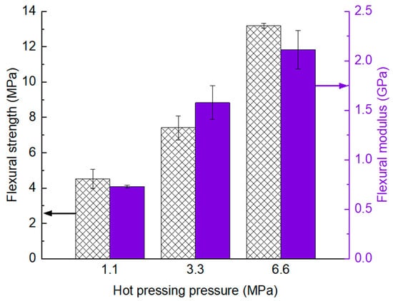 Effect of hot-pressing pressure on the flexural strength (pattern fill) and modulus (solid fill) of the non-post-cured Glass/PU-88/12 composite hot pressed at a temperature of 160 °C for 1 min.