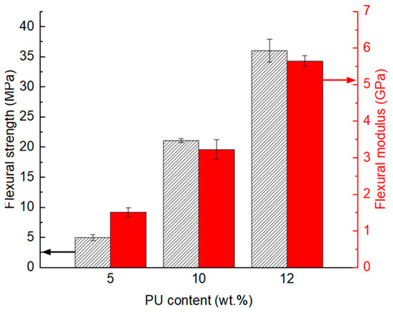 Glass/PU composites with a polymeric binder content of 5 wt.%, 10 wt.% or 12 wt.% were manufactured using optimised hot-pressing conditions (e.g., cure temperature of 160 °C, 6.6 MPa applied pressure, 1 min hot pressing). These glass/PU composites with different binder content were post-cured at 80 °C for 24 h before being subjected to flexural, tensile and compression tests. Figure 6 shows the flexural properties of the glass/PU composites incorporating 5 wt.%, 10 wt.%, or 12 wt.% PU. Increasing the polymeric binder content increased the flexural strength of the resulting glass/PU composites. Flexural strength values of 5 MPa, 21 MPa and 36 MPa were measured for glass/PU composites incorporating 5 wt.%, 10 wt.% and 12 wt.% PU, respectively. Similarly, the flexural modulus increased with the increase in the PU content. Flexural moduli values of 1.5 MPa, 3.2 MPa and 5.7 MPa were measured for glass/PU composites, respectively, incorporating 5 wt.%, 10 wt.% and 12 wt.% PU. The enhancement in flexural properties with the increase in the PU content can be attributed to two factors. Firstly, the increase in the polymeric binder reduces porosity in the resulting glass/PU composites, as the polymer infiltrates the pores between the glass particles. Secondly, the higher polymeric binder content enhances interfacial bonding between the glass particles and the polymer matrix, resulting in increased adhesion and flexural load-carrying capacity. These outcomes are consistent with findings reported elsewhere in the literature [15,16,19].