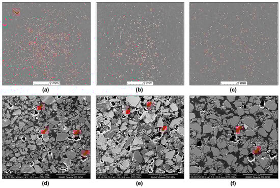 The CT images provide information at a macroscale level regarding the interactions between the glass particles and the polymeric matrix, while SEM analysis allows for microscale observations of the same interactions. The SEM images of the glass/PU composites incorporating varied PU content are shown together with the CT images in Figure 7. It is apparent that the void content in the glass/PU composites decreases with the increase in the PU content. The void content in Glass/PU-95/5 (Figure 7d) was significantly greater than the corresponding void volume fractions in the Glass/PU-90/10 (Figure 7e) and Glass/PU-88/12 (Figure 7f) composites.
