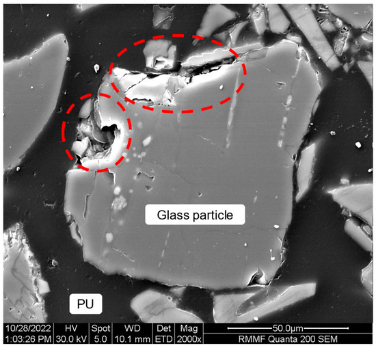SEM image of the Glass/PU-95/5 composite revealing debonding at the polymeric binder and glass particle interface (within red dashed lines).