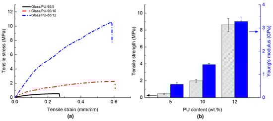 (a) The tensile stress–strain profiles and (b) the tensile strength (pattern fill) and modulus (solid fill) of glass/PU composites with PU content varying between 5 wt.% and 12 wt.%. The glass/PU composites were hot pressed at 160 °C, under a pressure of 6.6. MPa for 1 min followed by post-curing at 80 °C over 24 h.