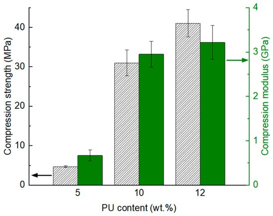 Glass particle-reinforced polymer composites are more likely to be adopted in the building and construction sector where they are prone to undergo compression loading. Therefore, it is critical to understand the compression response of the glass/PU composites as well. The compression properties of glass/PU composites incorporating different polymeric binder content are shown in Figure 10. The increase in polymeric content from 5 wt.% to 12 wt.% improved the compression strength from 4.7 MPa to 41 MPa. The compression modulus also increased with the increase in the polymeric binder content. The compression modulus increased by more than four-fold from 0.7 GPa to 3.2 GPa as the PU content increased from 5 wt.% to 12 wt.%. The increase in the polymeric binder content improved interfacial adhesion between the glass particles and the matrix, thereby enhancing the compression properties. However, when the PU content was low (i.e., 5 wt.%), the cracks initiating under compression loading propagated rapidly through the composite due to the presence of voids within the matrix and disbonded glass/PU interfaces. In contrast, when the concentration of polymeric binder was relatively high (i.e., 12 wt.%), the improved interfacial bonding with the glass, which reduced the void content and debonded interfaces consequently slowed down crack propagation.