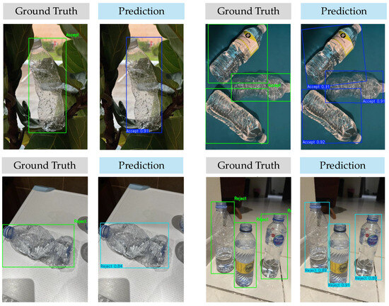 Standard evaluation metrics, such as precision (P), mean average precision (mAP), recall (R), and intersection over union (IoU), were used to assess the model performance in accepting or rejecting PET bottles [