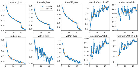 Table 3, were selected to establish a robust baseline and ensure stable convergence on our custom dataset. The AdamW optimizer was utilized, a choice automatically determined by the Ultralytics framework’s default settings, which are favored for their adaptive learning rate capabilities and robust performance in deep learning tasks. The associated learning rate of 0.00167, momentum of 0.9, and weight decay of 0.0005 were the default values for this optimizer, providing a proven and effective starting point for fine-tuning without extensive manual tuning. The Image size was set to 640 × 640 pixels, a standard resolution for many state-of-the-art object detection models, including YOLO, as it offers a strong balance between retaining sufficient feature detail for accurate detection and managing computational load. The batch size was set to four, a practical necessity determined by the hardware constraints. The training was conducted for a maximum of 50 epochs to allow the model sufficient passes over the data to converge. Also, to prevent overfitting and save computational resources, an early stopping mechanism was implemented with a patience of 30 epochs. This value was chosen to provide a generous window for the model to overcome potential performance plateaus and find its true peak on the validation set before halting the training process.