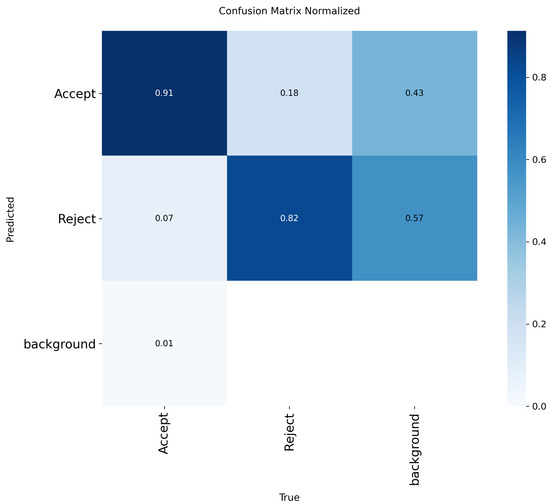 Table 4. According to the findings, the model achieved 89% mAP@0.5:0.95 in detecting PET bottles. Precision in both classes reached 91%, which indicates that most of the model predictions were correct. While recall for both classes was 85%, indicating that the model missed some rejected bottles. Given the well-balanced distribution of instances between the ‘Accept’ and ‘Reject’ classes in the training dataset shown in