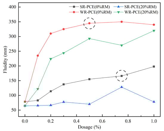 Effect of superplasticizer dosage on paste fluidity with various red mud dosages.