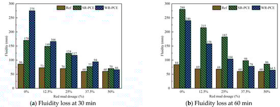 Impact of different superplasticizers on the fluidity loss of paste (reference group, 0.75% SR-PCE, and 0.5% WR-PCE) with various red mud dosages.