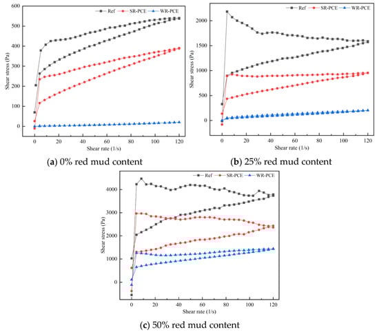 - At 0% and 25% red mud contents, the yield stress of the WR-PCE-incorporated paste approached to near zero, resembling a Newtonian fluid with optimal dispersibility. In contrast, the reference group and the SR-PCE-incorporated paste behaved as Bingham fluids. The plastic viscosity order was as follows: reference group > SR-PCE > WR-PCE. As the red mud content increased, the paste’s shear stress and apparent viscosity increased. When the red mud content reached 50%, all pastes exhibited Bingham fluid characteristics, maintaining the following plastic viscosity order: reference group > SR-PCE > WR-PCE.