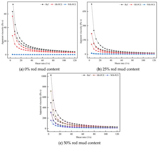 Figure 6 illustrates how PCE affects the apparent viscosity of red mud blended cement paste with red mud contents of 0%, 25%, and 50%, while Table 4 presents the impact of PCE on these pastes’ plastic viscosity. When the red mud content was 0% or 25%, the apparent viscosity of the reference group and the SR-PCE-incorporated paste increased with the shear rate. In contrast, the WR-PCE-incorporated paste showed minimal fluctuations in apparent viscosity. Once stabilized, the viscosities of all three pastes approached zero, representing the plastic viscosity, with the order of magnitude being as follows: reference group > SR-PCE > WR-PCE. When the red mud content was 50%, the apparent viscosity of the reference group, SR-PCE-incorporated paste, and WR-PCE-incorporated paste decreased with increasing shear rate. Upon stabilization, the viscosities of all three pastes again approached zero, indicating plastic viscosity, with the same order of magnitude: reference group > SR-PCE > WR-PCE. This observation aligns with the findings in Section 3.2.3.