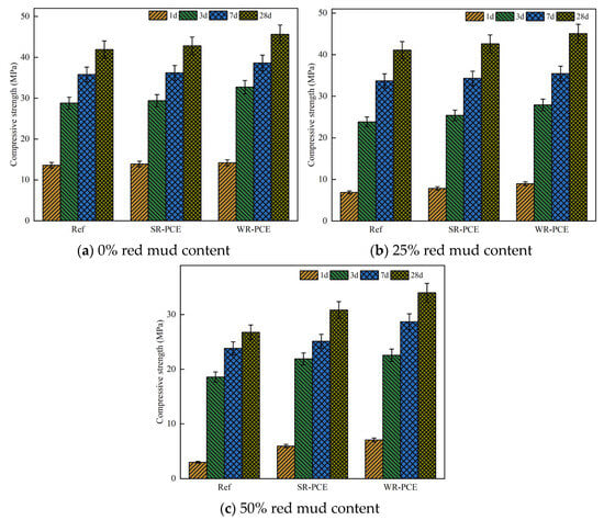 Figure 7 displays the specimens’ compressive strength at 1, 3, 7, and 28 days, with superplasticizers added at 0%, 25%, and 50% red mud contents. The data reveal that the compressive strength of the PCE-enhanced paste was marginally greater than that of the reference group across all red mud contents (0%, 25%, and 50%). This suggests that the addition of PCE not only does not compromise the compressive strength of red mud blended cement paste but also has a slight strengthening effect. The enhancement can be attributed to the disruption of the flocculation state among cement particles by PCE. The anionic PCE molecules attach to the surfaces of red mud and cement particles, creating electrostatic repulsion. The spatial resistance effect of PCE’s long side chains further disperses the cement particles, freeing up water, which then participates in the hydration process, resulting in more hydration products [30].