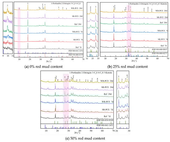 For red mud contents of 25% and 50% (Figure 8b,c), the 28-day samples with SR-PCE and WR-PCE showed higher peak intensities of C-S-H and Ca (OH)2 compared to the samples without water-reducers. This indicates that SR-PCE and WR-PCE enhance the hydration degree of C2S and C3S over time, producing more C-S-H and hence improving strength. Additionally, the presence of hydrogrossular (Ca3Al2 (SiO4) 3−x (OH)4x) peaks is due to the red mud addition. The intensity of hydrogrossular peaks decreased in the 28-day samples compared to the 7-day samples, suggesting that red mud participates in the hydration reaction, which is not complete [33]. In the in-depth analysis of the diffraction patterns, the peak position of Ca (OH)2 in the samples doped with WR-PCE exhibited a subtle shift. This phenomenon could be attributed to the dispersion effect imparted by WR-PCE and its impact on the crystallization process of the hydration products. Specifically, it might have led to minor lattice distortions or alterations in the integrity of its crystallization. Furthermore, the broadening of certain peaks was also noted. This can be associated with multiple factors, such as the crystal structure, sample inhomogeneity, and physical transformations [34].