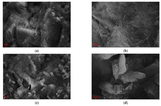 Figure 9 presents the SEM images at 28 days (magnifications of ×5000 and ×20,000) for the hardened red mud blended cement paste from the reference group, SR-PCE, and WR-PCE with a 25% red mud dosage. Figure 9a,b show a substantial formation of fibrous C-S-H gels and flaky Ca (OH)2 crystals. The fibrous C-S-H gels not only adhered to the flaky Ca (OH)2 but also effectively filled the pores, densifying the matrix structure. At a magnification of ×5000 (Figure 9c), numerous uniformly distributed flocculated structures were observed. These structures were adsorbed onto the surfaces of cement particles and were evenly distributed throughout the cement paste.