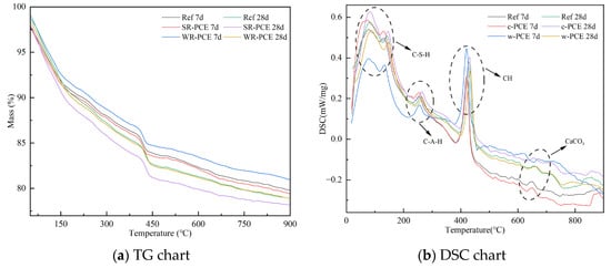 TG and DSC plots of hardened paste in the reference, SR-PCE, and WR-PCE groups (7 and 28 days).