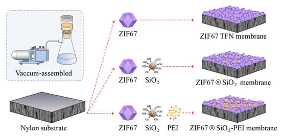 Silica (SiO2) nanoparticles are inexpensive, easy to process, and intrinsically hydrophilic; consequently, their incorporation into membranes can markedly improve surface wettability, thereby increasing water flux and enhancing antifouling performance. Building on these advantages, we devised a facile vacuum-assisted assembly that simultaneously embeds ZIF-67 and SiO2 into a porous nylon substrate, yielding a series of TFN membranes. Branched polyethyleneimine (PEI) serves as a molecular cross-linker, coordinating with ZIF-67 and hydrogen bonding to SiO2 to stabilise an integrated hybrid network and enhance chemical robustness. The resulting ZIF@SiO2 TFNs were systematically characterised for surface composition, hydrophilicity, charge density, morphology and filler topology. Their performance was subsequently evaluated through pure-water permeance measurements and rejection tests using representative dyes and inorganic salts. These investigations clarify the bridging role of PEI, reveal the synergy between MOF porosity and silica hydrophilicity, and establish explicit structure–property–performance relationships for this new membrane platform.