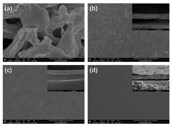FESEM images of (a) porous nylon substrate; (b) ZIF-67 TFN membrane (surface and cross-section); (c) ZIF@SiO2 TFN membrane (surface and cross-section); and (d) ZIF@SiO2-PEI TFN membrane (surface and cross-section).
