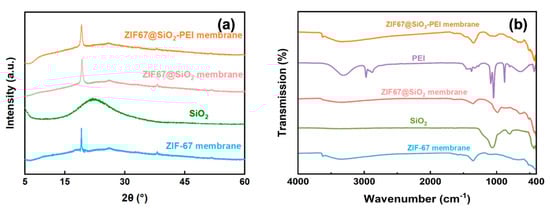(a) XRD pattern and (b) FTIR of SiO2, ZIF-67, ZIF@SIO2, and ZIF@SIO2-PEI.