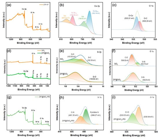 (a) XPS spectra of ZIF-67 membrane; (b,c) high-resolution curve-fitted spectra of Co 2p and O 1s; (d) XPS survey spectra of SiO2 and ZIF@SIO2; (e,f) high-resolution curve-fitted spectra of Si 2p, O 1s; (g) XPS survey spectra of ZIF@SIO2-PEI; and (h,i) high-resolution curve-fitted spectra of N 1s, O 1s.
