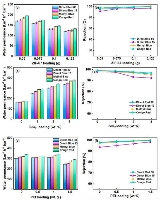 The effect of PEI cross-linking was assessed by introducing varying amounts of PEI into the ZIF@SiO2 (2%) formulation and evaluating flux and rejection towards dyes of different molecular weights (Figure 5e,f). Increasing the PEI content from 0 to 1 wt % produced only a minor change in water permeance, but a further increase to 1.5 wt % caused a sharp decline; e.g., the flux for DR 80 fell to 244 L m−2 h−1 bar−1 because excess polyamine densified the selective layer and narrowed water-transport pathways, thereby elevating hydraulic resistance [25]. In contrast, dye rejection improved progressively with PEI loading (Figure 5f). The enhancement is attributed to two cooperative effects: (i) PEI coordinates to Co2+ centres in ZIF-67 and forms hydrogen bonds with silanol groups on SiO2, tightening the interlayer spacing and sealing defects, and (ii) the protonatable amine groups introduce additional positive charge, strengthening electrostatic exclusion of the anionic dyes. The optimum balance was achieved at 1 wt % PEI, where the membrane delivered a permeance of 362 L m−2 h−1 bar−1 together with 99.4% rejection of Methyl Blue, evidencing the synergistic contribution of size-sieving and charge repulsion.
