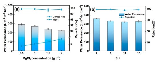 Separation performance of ZIF@SIO2-PEI membrane with (a) MgCl2 concentration and (b) pH.
