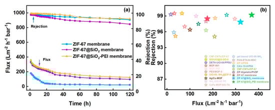 (a) Long-term stability of ZIF-67, ZIF@SIO2-PEI, and ZIF@SIO2-PEI TFN membranes within a 50 mg L−1 Congo Red solution. (b) Analysing the performance of TFN membranes against data.