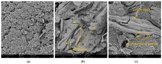 The cross-sectional image of the neat polymer sample (Figure 1a) reveals a relatively uniform, fine-grained morphology characteristic of plasticized starch matrices. The absence of visible inclusions or major irregularities indicates a proper processing method. However, the observed microporosity within the structure may be attributed to the migration of water or plasticizer during the cooling process, a phenomenon well-documented in starch-based systems [60]. In the case of the sample shown in Figure 1b, containing 50 wt% CH filler, numerous filler particles with distinctly irregular shapes are distributed throughout the matrix volume. The structure of the filler is complex. The particles exhibit sharp, brittle surfaces and vary in size, which is a result of the mechanical grinding of the husks before their incorporation into the composite. The filler appears to be randomly arranged, with no preferential orientation, which is typical for composites formed by injection molding or hot pressing [61]. The degree of mixing suggests a relatively uniform dispersion of particles; however, local agglomerates or areas of increased filler concentration can be observed, which may lead to non-uniform stress distribution within the material [62]. A significant aspect visible in Figure 1b,c is the quality of the bonding between the polymer phase and the filler. In many areas, clear gaps can be seen around the CH particles, which suggests insufficient wetting of the filler surface by the polymer. This may indicate that the dominant type of interfacial adhesion is physical bonding (mechanical interlocking), and in some cases, so-called keying effects may occur, resulting from the mechanical anchoring of the polymer within the micropores of the filler surface [40]. Figure 1c provides a detailed view of the polymer–filler interface in the transition zone. In select regions, the polymer matrix intimately surrounds the husk particles without detectable voids, implying the presence of localized chemical bonding. These bonds likely arise from interactions between hydroxyl groups present in both the polymer and the lignocellulosic constituents of CH (cellulose, hemicellulose, and lignin). Although such chemical interactions are limited and spatially inconsistent, they may locally enhance interfacial adhesion and contribute to improved mechanical performance of the composite. Overall, SEM analysis demonstrates that filler particles exhibit varying degrees of embedding within the polymer matrix. While some particles are well-integrated, the frequent presence of interfacial voids may detrimentally impact the mechanical properties of the composites, particularly with regard to stress transfer efficiency at the filler–matrix interface [63].