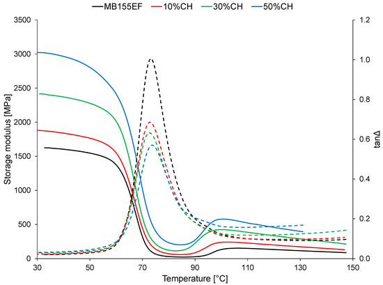 The presence of the filler exerted a pronounced effect on the absolute values of the storage modulus. Most notably, a distinct increase in E′30 was recorded with the addition of filler particles. The increase in stiffness was directly proportional to the filler content. The addition of 10 wt% CH filler raised E′30 to 1879 MPa, approximately 15% higher than that of the MB155EF matrix. A 50 wt% filler loading increased E′30 to 3023 MPa, nearly double the value observed for the neat polymer. This indicates that the composite samples exhibited significantly higher stiffness.