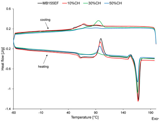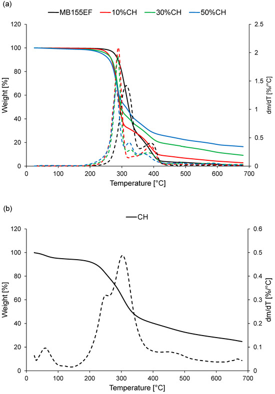 The incorporation of CH filler into the MB155EF matrix did not alter the general shape of the thermal curves. All thermal events observed in the neat polymer matrix were retained in the composites, with no additional thermal transitions attributable to the presence of the filler detected.