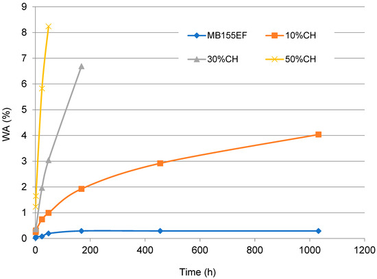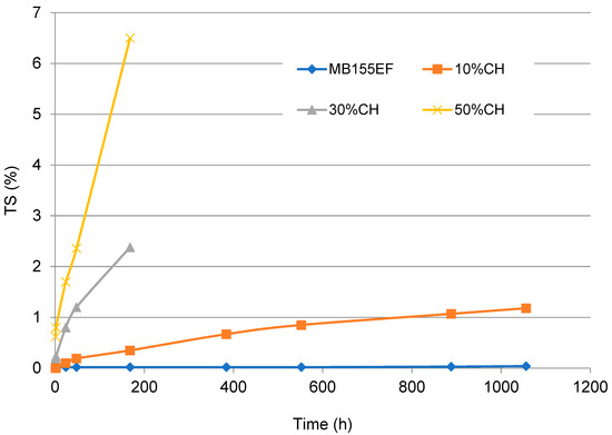 In this study, the effects of water immersion time on WA (Figure 5) and TS (Figure 6) were investigated for composites based on the MB155EF polymer filled with ground CH as well as for the neat polymer. The results demonstrated a significant dependence of both parameters on immersion time and filler content.