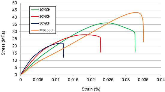 Figure 7. The effect of filler content on the stress–strain relationship under tensile load of the tested composites.