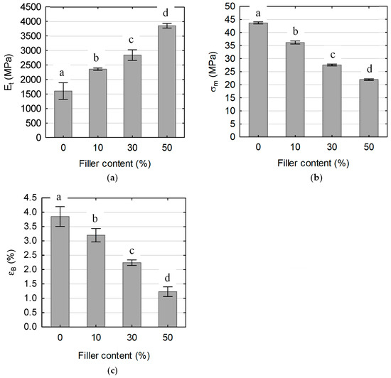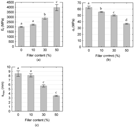 Figure 8. Effect of filler content on tensile properties of tested composites: (a) tensile modulus, (b) tensile strength, and (c) elongation at break. Mean values with the same letter for the given property are not statistically different at the 5% significance level.
