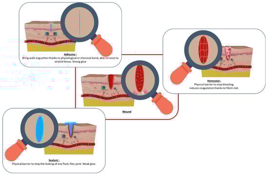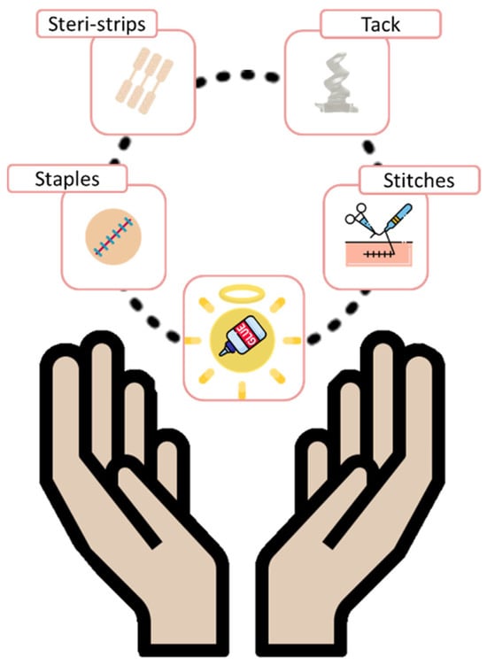 Since ancient times, various methods have been employed in the treatment of wounds and surgical interventions to close tissues or affix both natural and synthetic implantable materials, such as surgical meshes. Staples, absorbable sutures, and more recently, steri-stripsTM are among the most commonly used tools for wound closure. Similarly, screws or sutures are traditionally used to anchor prosthetic materials to internal tissues. These techniques remain widely practiced due to their ease of use and high tensile strength. However, from a clinical perspective, they are often poorly adapted to modern surgical demands—particularly in minimally invasive and laparoscopic procedures—due to several technological shortcomings. They are invasive, time-consuming, often require removal through a second intervention, and may lead to leakage of biological fluids [1]. Moreover, they can cause pain, scarring, delayed healing due to poor tissue integration, and, in severe cases, infections. Such drawbacks directly conflict with key clinical goals of reducing surgical trauma, improving postoperative recovery, and enabling seamless integration of biomaterials [2,3,4].