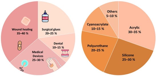 Medical adhesives market distribution by application and by polymer: $9.3B in 2022 [31].