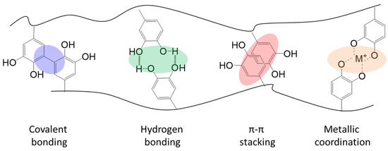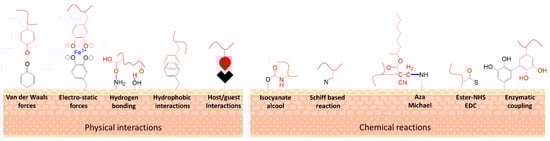 Physical interactions do not involve the formation of covalent bonds but rely on weaker, non-covalent forces that play a critical role in adhesion, especially under wet or complex conditions similar to those encountered in biological systems. The main types of physical interactions include [41,42,43,44]: