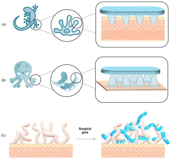 Adhesion in surgical adhesives arises from several distinct mechanisms, among which mechanical interlocking is particularly important for ensuring effective adhesion to complex and irregular biological substrates. It is essential to distinguish this mechanism from physical adhesion, a term that more accurately refers to non-covalent molecular interactions such as van der Waals forces, hydrogen bonding, and electrostatic attractions—all of which operate at the nanometer scale between closely apposed surfaces. In contrast, mechanical interlocking (also referred to as mechanical anchoring) describes the physical penetration and entanglement of adhesive polymers into the microporous structures or surface irregularities of tissues. This process creates a form of topographical adhesion whereby the adhesive conforms to and becomes entrapped within the contours of the tissue. Biological substrates such as the dermis, fascia, and trabecular bone naturally contain microarchitectures that facilitate this type of anchoring. Unlike chemical bonding mechanisms, mechanical interlocking is largely independent of surface chemistry (e.g., pH, charge, protein presence), making it particularly effective in wet or physiologically variable environments where covalent or ionic bonding might be hindered. The entanglement of polymer chains within tissue features contributes significantly to the mechanical strength and stability of the adhesive interface. This mechanism is inspired by natural adhesion strategies observed in gecko feet, octopus suckers, and worm mucus networks, where physical structures—not chemical bonds—play the dominant role in adhesion, as illustrated in Figure 7 [4,44,45,46,47,48].