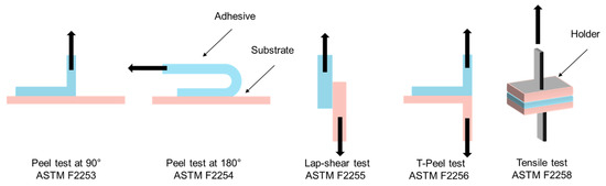 Evaluating the performance of surgical adhesives requires standardized adhesion tests that simulate the mechanical stresses encountered in vivo. These tests quantify the force necessary to separate adhered surfaces and help identify failure modes—whether interfacial, cohesive, or substrate-related. The most commonly employed tests in both the adhesive industry and surgical applications include the 90° and 180° peel tests, the lap shear test, the T-peel test, and the tensile test. Each of these methods provides valuable insights into the mechanical behavior and failure characteristics of surgical adhesives. These tests are illustrated in Figure 8 [6,52,53,54,55].