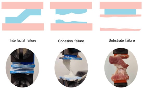 Scheme and pictures of interfacial, cohesion, and substrate failure.
