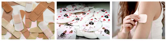 Currently, most skin adhesives are based on pressure-sensitive adhesives (PSAs), which are viscoelastic polymers that bond to surfaces temporarily upon the application of pressure. The adhesion of PSAs is governed by a balance between flow and resistance to flow [60]. The largest segment of PSAs for skin is used for wound protection. Initially, hospital tapes were made from natural rubber [57], but these have since been replaced by synthetic materials. In 1899, Johnson & Johnson (J&J) introduced the first synthetic medical tape. In 1920, they developed the widely used, multi-purpose skin adhesive—plaster—by placing a piece of gauze over a strip of tape, calling it Band-Aid® (J&J). NexcareTM (3M) is another well-known brand. The second largest market for medical adhesives is for electrode attachment (e.g., for electrocardiogram measurements or transcutaneous electrical nerve stimulation), with 3M’s Red-DotTM dominating this space. The third market involves Transdermal Drug Delivery Systems (TDDS) (Figure 10) [61], which, although small in terms of the number of units sold, are significant due to the high cost of devices. In all three cases, PSAs are used. These adhesives are non-reactive, operate at room temperature through substrate wetting, and lose adhesion as the temperature drops. Their adhesion depends on the viscoelasticity of the adhesive and Van der Waals interactions with the substrate. Typically, PSA formulations consist of an elastomer (e.g., polyacrylates) and a tackifier (e.g., ester rosin).