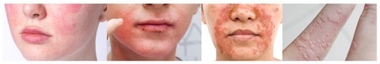 Examples of inflammatory skin conditions potentially relevant to adhesive biocompatibility studies. From left to right: mild erythema and dryness on the cheeks, suggestive of mild atopic dermatitis or rosacea; perioral inflammation and fissuring, potentially indicative of perioral dermatitis or contact dermatitis; severe facial inflammation with exudation and crusting, consistent with infected atopic dermatitis or possibly eczema herpeticum; pronounced xerosis and fissures on the fingers, potentially associated with chronic hand eczema or severe skin dryness.