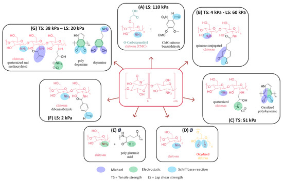 - Park, M.K.; Li, M.X.; Yeo, I.; Jung, J.; Yoon, B.I.L.; Joung, Y.K. Balanced Adhesion and Cohesion of Chitosan Matrices by Conjugation and Oxidation of Catechol for High-Performance Surgical Adhesives. Carbohydr. Polym. 2020, 248, 116760. [Google Scholar] [CrossRef]